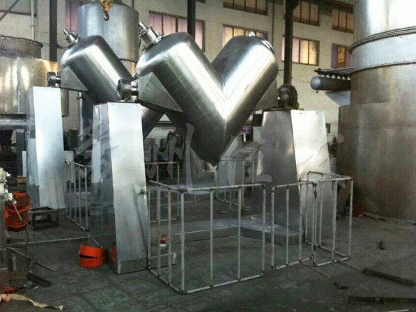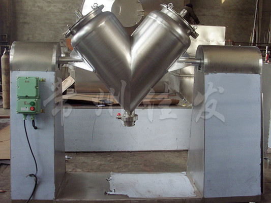 該機通過機械傳動,使不對稱的V型圓柱體內(nèi)的物料做往復(fù)翻動,達(dá)到均勻混合之目的。